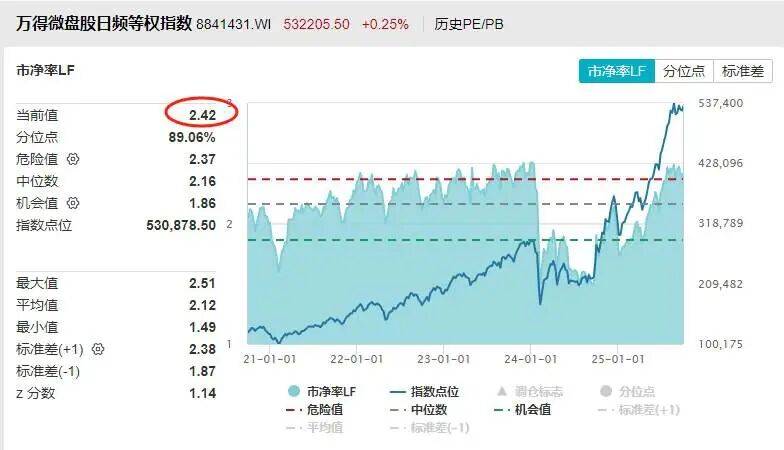 过往两年微盘股指数的PB上限大致在2.5倍左右,如果达到2.5倍的上限,他认为就要谨慎对待。