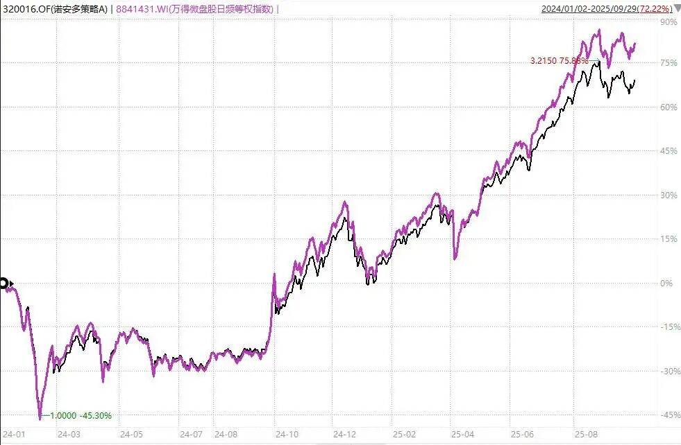 2024初暴跌那一波,诺安多策略最大回撤达到45%,不过,大涨的时候也能直接弹射起飞,今年来诺安多策略涨幅超过了60%,应该是业绩最好的微盘基金。