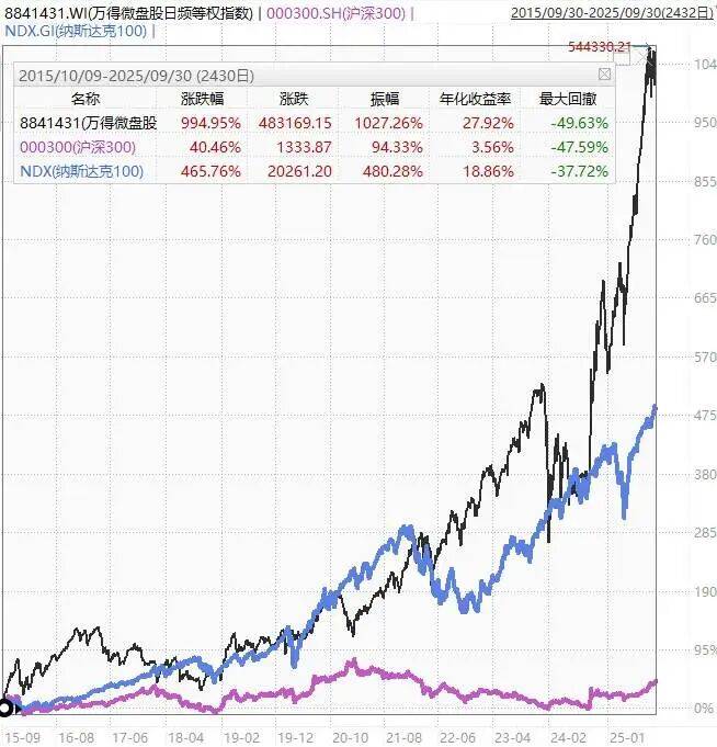 过去十年,万得微盘指数涨幅接近10倍(995%),纳斯达克100涨幅是466%,而沪深300涨幅只有40%。
