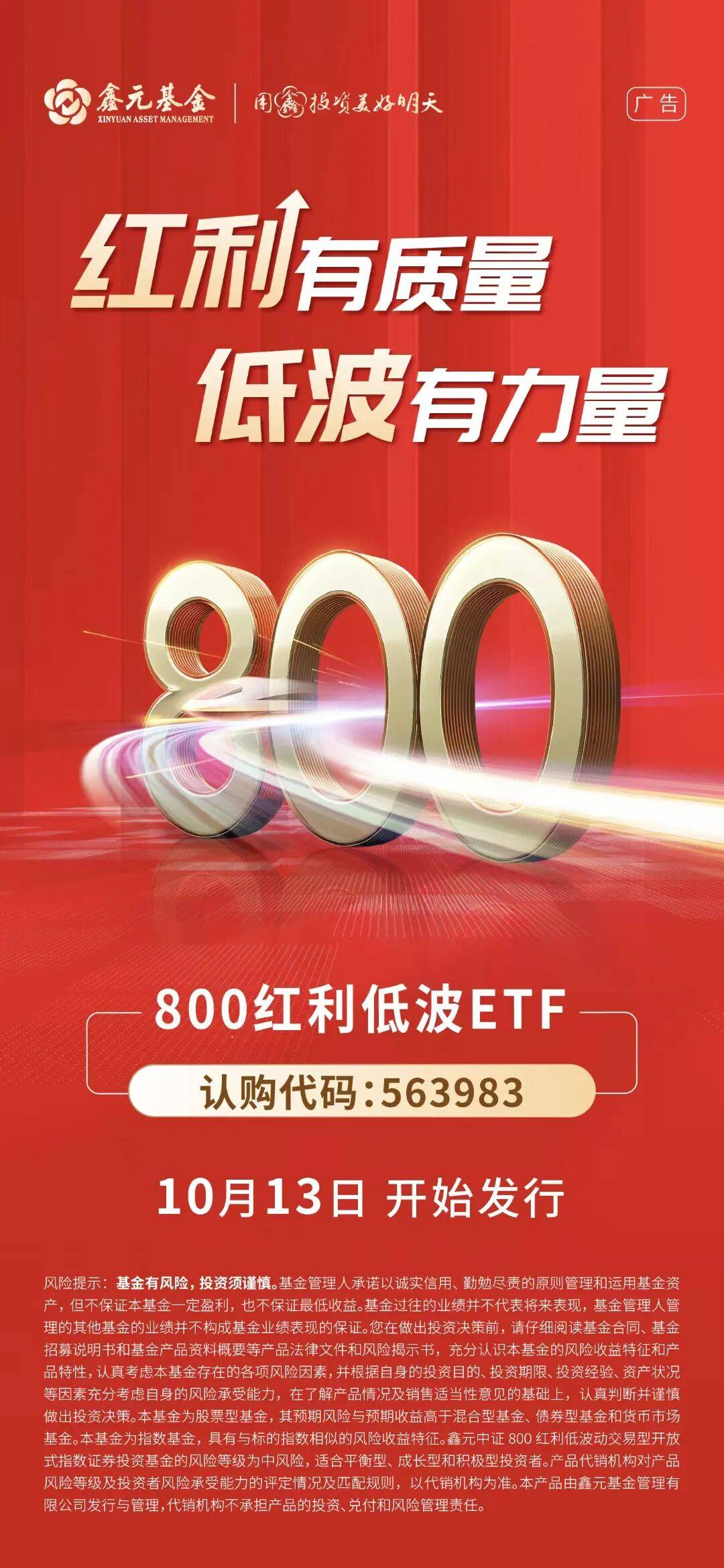 风险提示:基金有风险,投资须谨慎。基金管理人承诺以诚实信用、勤勉尽责的原则管理和运用基金资产,但不保证本基金一定盈利,也不保证最低收益。基金过往的业绩并不代表将来表现,基金管理人管理的其他基金的业绩并不构成基金业绩表现的保证。您在做出投资决策前,请仔细阅读基金合同、基金招募说明书和基金产品资料概要等产品法律文件和风险揭示书,充分认识本基金的风险收益特征和产品特性,认真考虑本基金存在的各项风险因素,并根据自身的投资目的、投资期限、投资经验、资产状况等因素充分考虑自身的风险承受能力,在了解产品情况及销售适当性意见的基础上,认真判断并谨慎做出投资决策。本基金为股票型基金,其预期风险与预期收益高于混合型基金、债券型基金和货币市场基金。本基金为指数基金,具有与标的指数相似的风险收益特征。鑫元中证800红利低波动交易型开放式指数证券投资基金的风险等级为中风险,适合平衡型、成长型和积极型投资者。产品代销机构对产品风险等级及投资者风险承受能力的评定情况及匹配规则,以代销机构为准。本产品由鑫元基金管理有限公司发行与管理,代销机构不承担产品的投资、兑付和风险管理责任。本材料中的信息不构成对特定公司、行业或市场的预测,也不构成投资建议,且仅代表鑫元基金在本材料成文时的观点,鑫元基金有权对其进行调整。