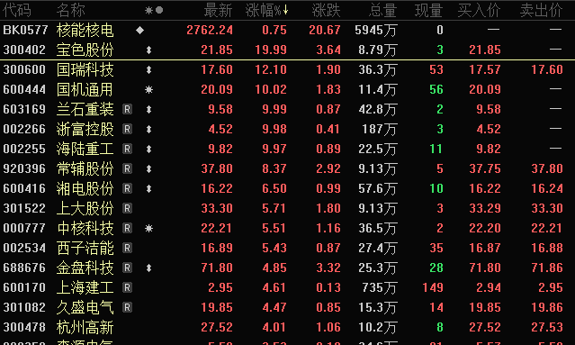 核电概念早盘走高,宝色股份(300402)“20cm”涨停,国瑞科技一度涨超19%,兰石重装、浙富控股、海陆重工涨停,常辅股份、国光电气等涨幅居前。