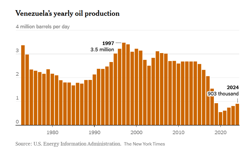 注意,我用了潜力这个词,而非现实。为什么?因为由于管理不善、投资不足和国际制裁,委内瑞拉的原油产量仅为其储量的很少一部分。