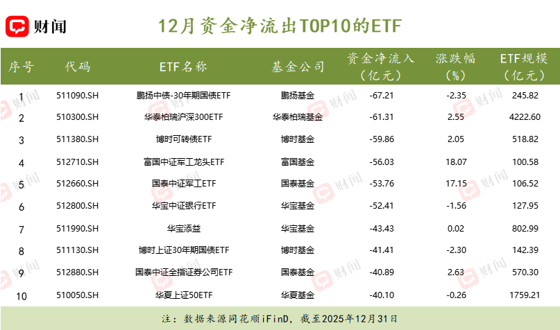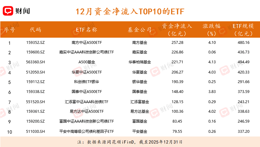 12月ETF市场资金流向呈现弃旧迎新格局。市场正从传统的避险与蓝筹逻辑,转向挖掘中盘股及优质固收资产的战略再平衡。资金流入端,南方、华夏、国泰等机构的中证A500ETF成为吸金主力,资金正从传统宽基转向更广泛的中盘股,与此同时,嘉实、银华等旗下的AAA科创债ETF也获大额流入,资金对高等级信用债的配置需求旺盛。