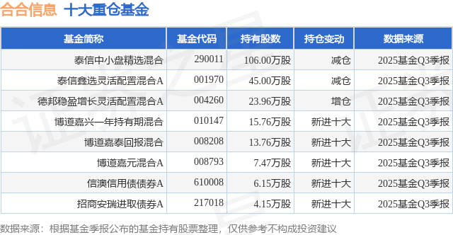 根据2025基金Q3季报公募基金重仓股数据,重仓该股的公募基金共8家,其中持有数量最多的公募基金为泰信基金的泰信中小盘精选混合。泰信中小盘精选混合目前规模为17.22亿元,最新净值5.118(1月8日),较上一交易日上涨1.89%,近一年上涨60.49%。该公募基金现任基金经理为董季周。董季周在任的基金产品包括:泰信鑫选灵活配置混合A,管理时间为2020年11月24日至今,期间收益率为28.88%。