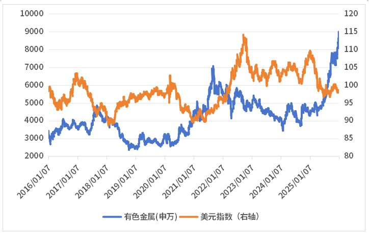 背后的逻辑在于,一方面,降息将带动实际利率下行,显著提升黄金等零息资产的吸引力;另一方面,美元在降息周期中往往走弱,等于是变相提升了有色金属的性价比。以过去10年为例,大部分时间中,申万有色金属指数的走势与美元指数具有较强的负相关性。