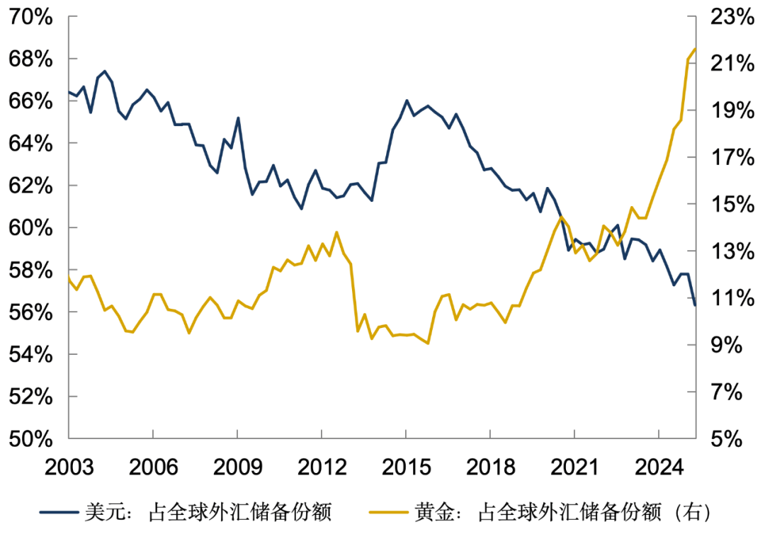 在当前地缘政治复杂、美元信用备受质疑的环境中,全球央行都选择增持黄金以实现外汇储备“去美元化”,构成支撑金价上涨的基本因素。参考世界黄金协会与IMF数据,截至2025年中,黄金在全球央行外汇储备中的比重升至23%,而美元降至56%,如果该趋势延续,那么到2040年左右,黄金将取代美元,重新成为全球第一大储备资产。(数据来源:中国货币市场,发布时间为2026.01.04)