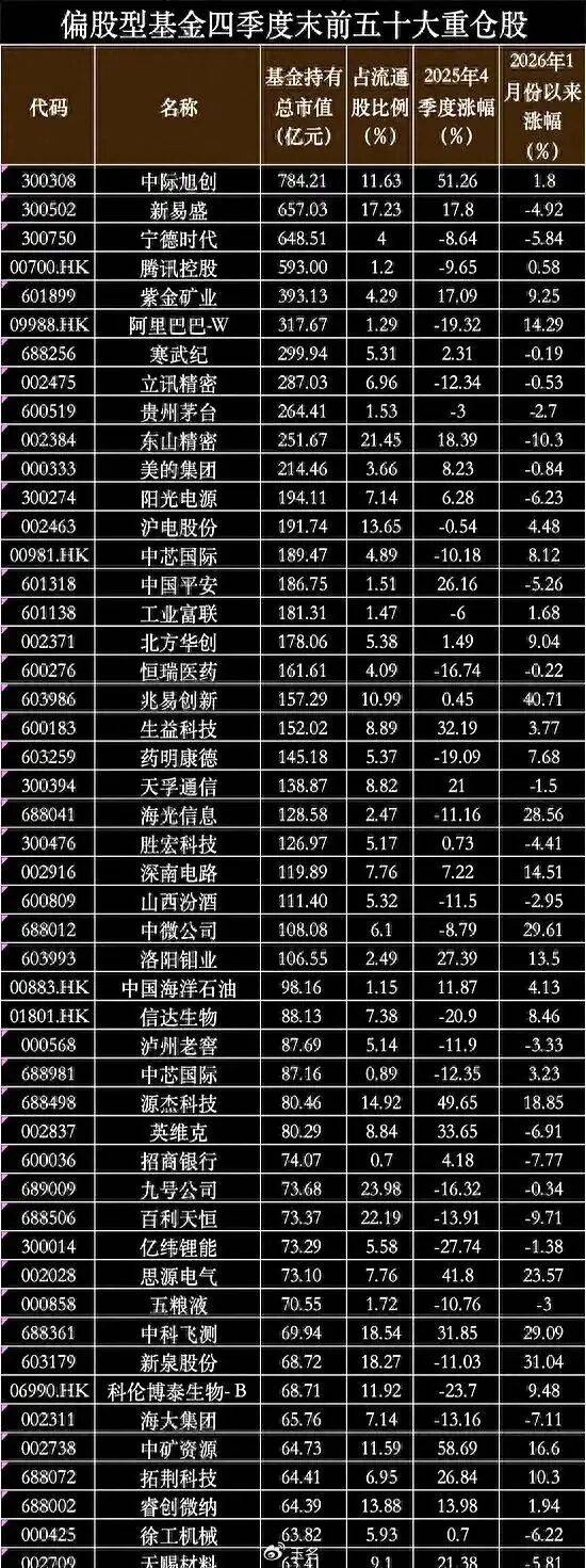 随着公募基金2025年四季报全部披露,中际-旭创替代宁德,首次登顶公募基金第一大重仓股。在2025年四季报里,中际-旭创首次成了公募基金的头号重仓股,1102只主动权益基金合计持仓市值达776.57亿元,单季度新增391只。然而,自2026年1月31日四季报披露完毕以来,2月份的前几个交易日,中际-旭创持续下跌,跌幅一度近20%。股民们都在热议,是不是公募基金第一大重仓股“魔咒”再现了?