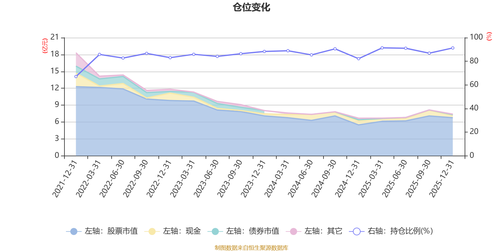 据定期报告数据统计,近三年平均股票仓位为87.7%,同类平均为86.12%。2025年一季度末基金达到91.35%的最高仓位,2021年末最低,为67.08%。