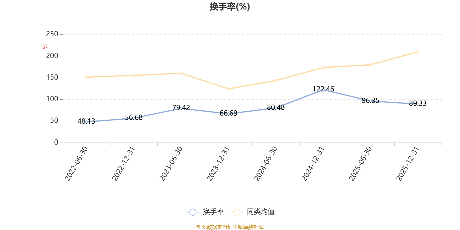 截至2025年12月31日,基金最近一年换手率约184.61%,持续低于同类均值。