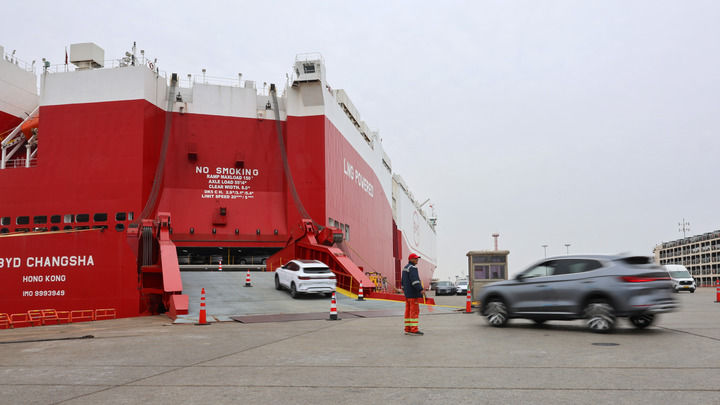 2026年3月24日,在上海外高桥的海通汽车滚装码头,工作人员引导国产新能源汽车驶入汽车滚装船。新华社记者 方喆 摄