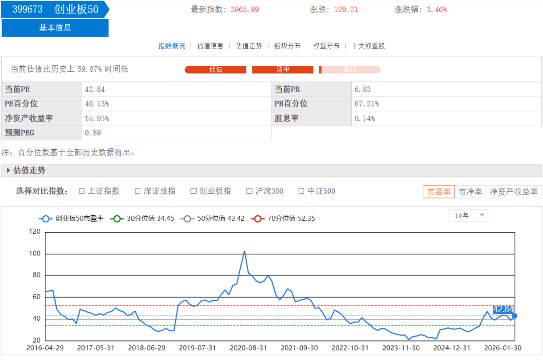 而这一轮相对来说PE估值是最低的,当下创业板50PE是43倍,2021年最高的时候是100倍。