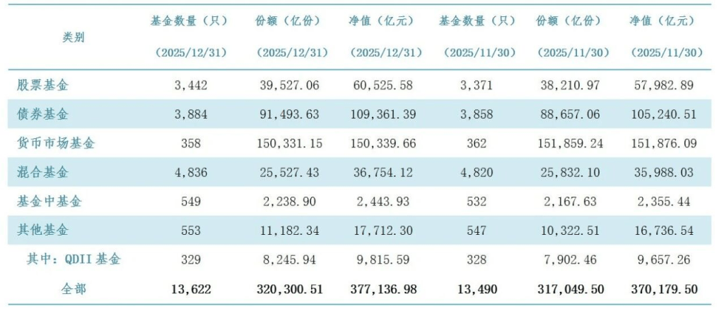 与此同时,公募基金产品数量持续扩容,2025年12月末全市场产品总数已达13622只,单月新增132只。